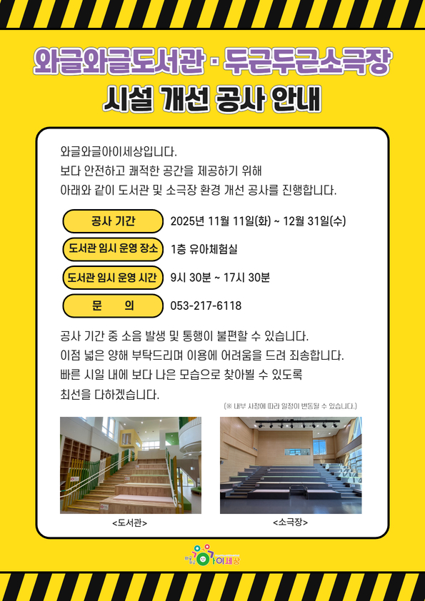 보다 더 안전하고 쾌적한 환경 조성을 위해, 와글와글아이세상 도서관 및 소극장 공사를 실시하게 되었습니다.