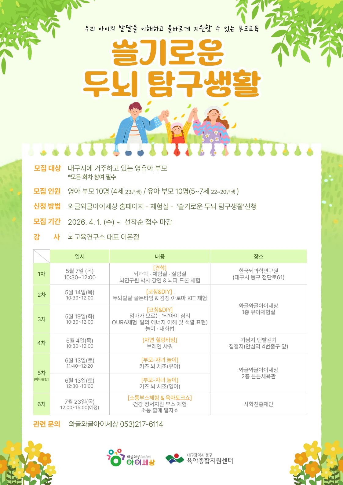 와글와글아이세상에서는 동구 육아종합지원센터와 함께 영유아 부모를 위한 「슬기로운 두뇌탐구생활」 프로그램을 운영합니다.