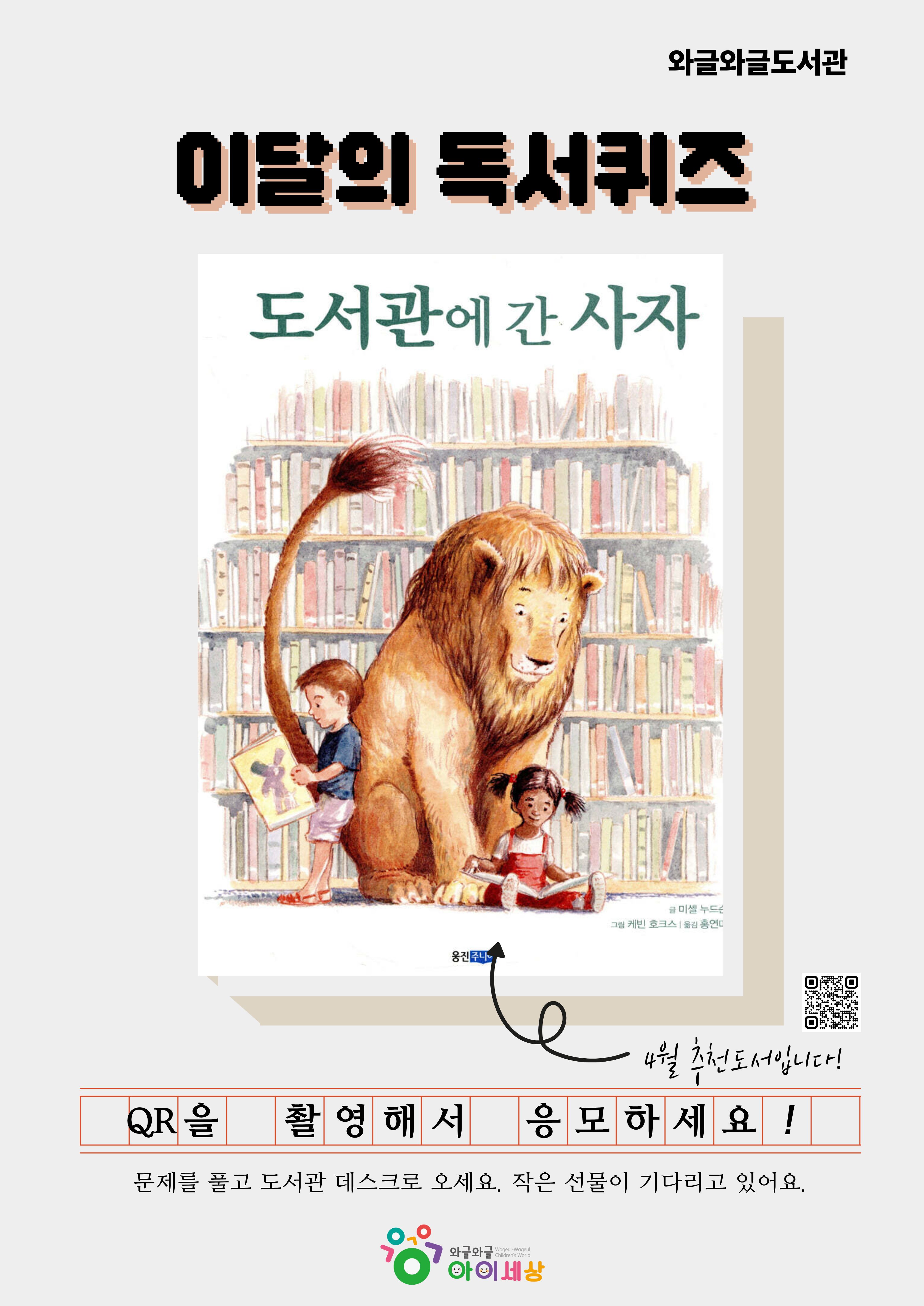 안녕하십니까? 와글와글 도서관입니다. 4월, 도서관의 날 및 도서관주간을 맞이하여 도서관과 책을 주제로 사서추천도서를 선정하였습니다. 그 중 『도서관에 간 사자』를 읽고 이 달의 독서퀴즈에 참여해보세요.
